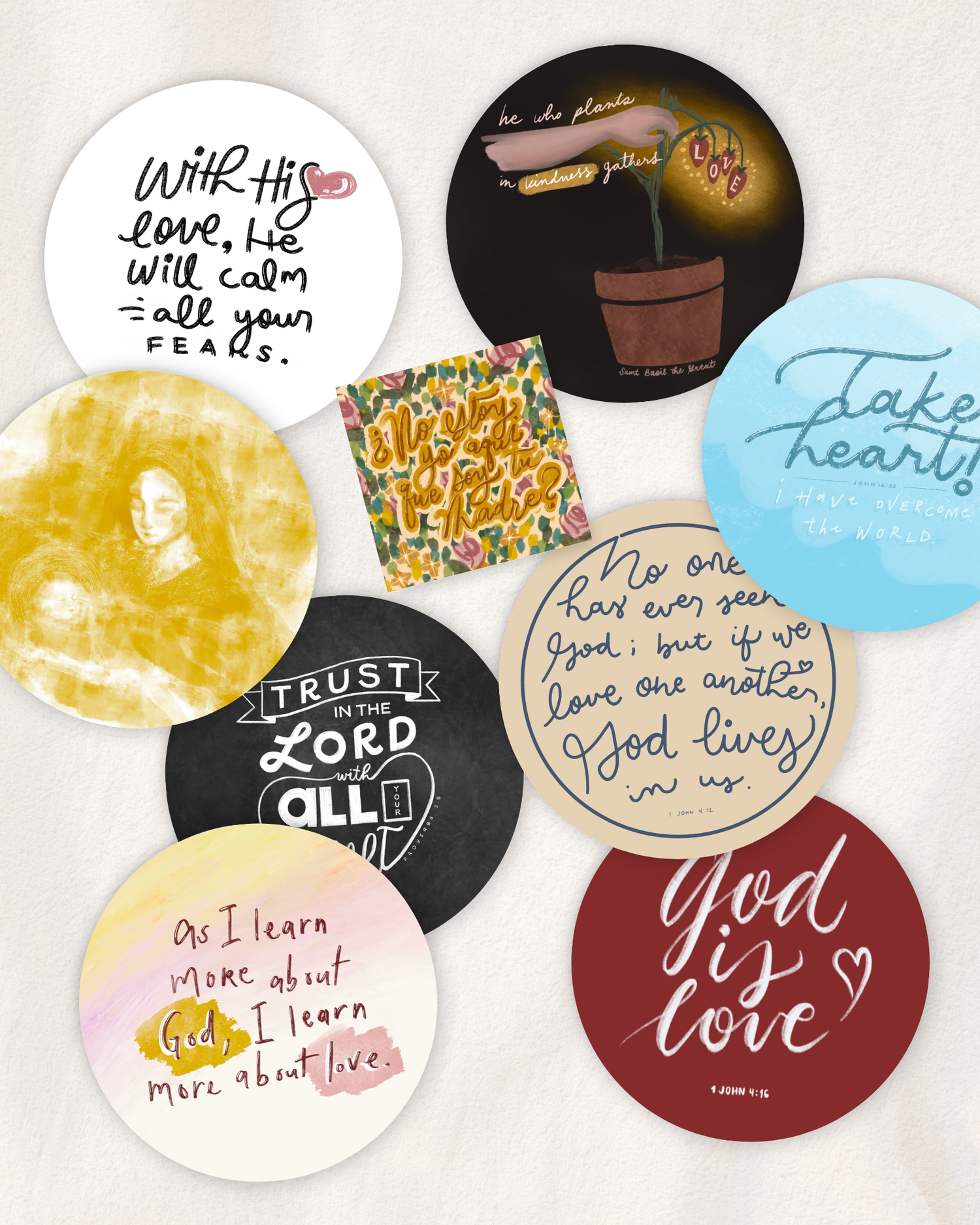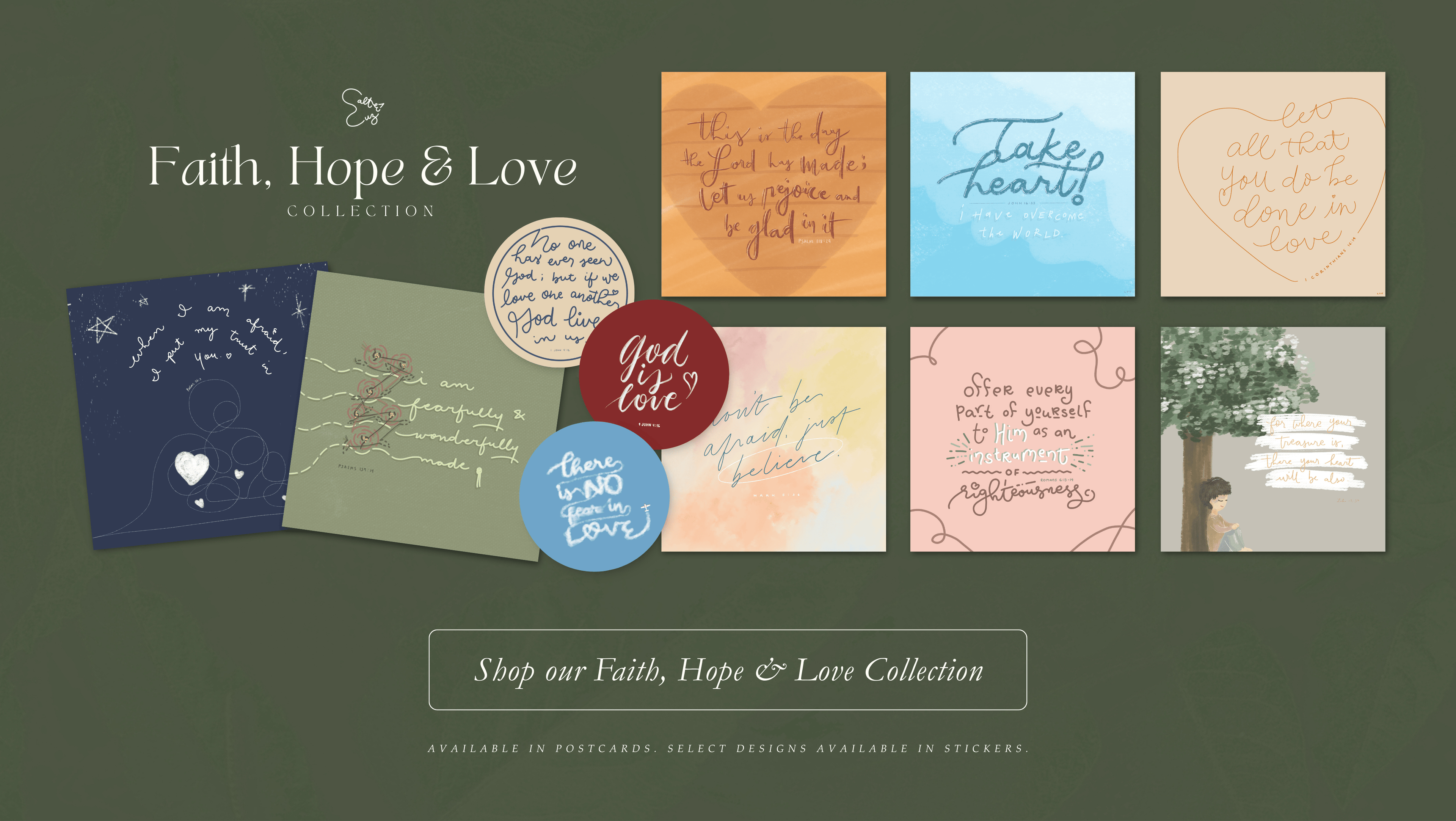 Explore our Faith, Hope & Love Collection available for purchase as a postcard set and available in stickers, sold separately.